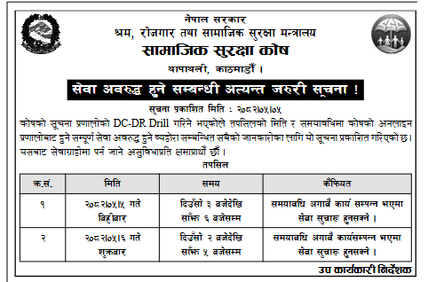 कोषले एक सूचना प्रकाशित गर्दै आज दिउँसो ३ बजेदेखि साँझ ६ बजेसम्म र शुक्रबार दिउँसो २ बजेदेखि साँझ ५ बजेसम्म अनलाइन सेवाहरू बन्द रहने जानकारी दिएको छ।