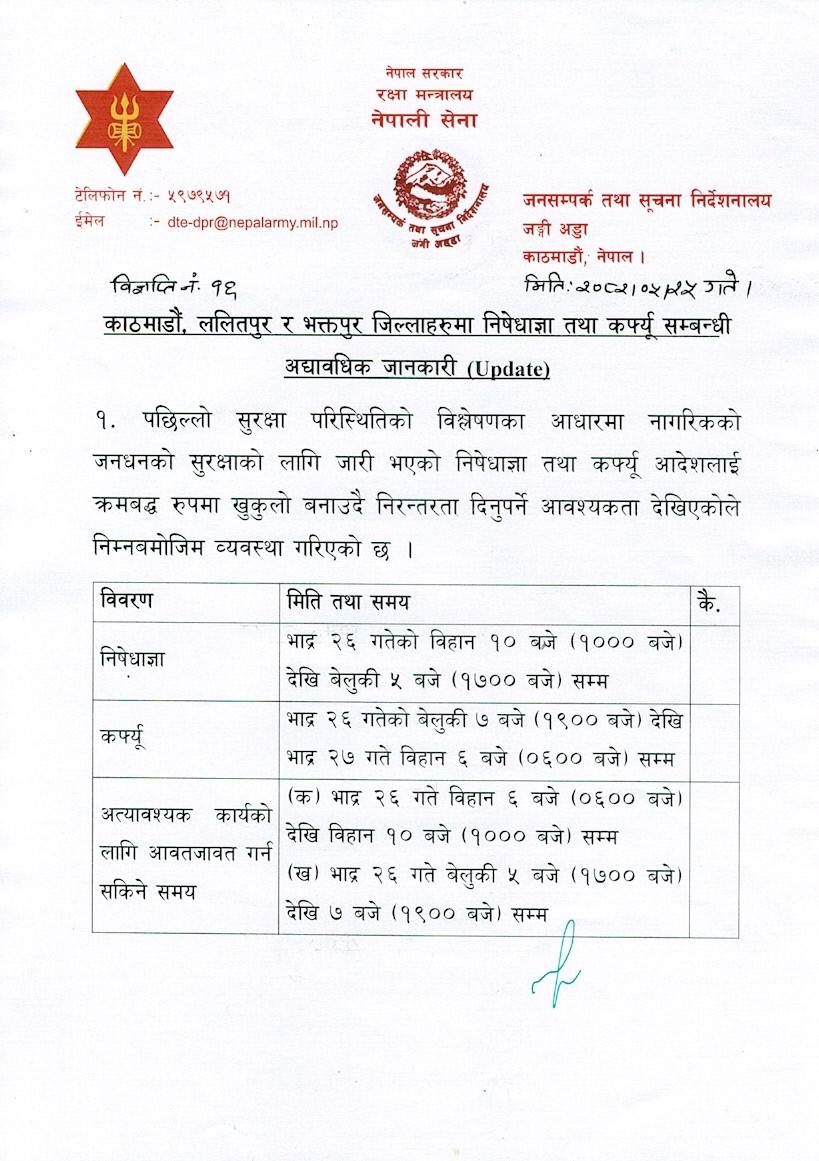 बेलुकी ७ बजेदेखि बिहान ६ बजेसम्म कर्फ्यु कायमै रहेको नेपाली सेनाले जनाएको छ ।